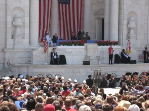 This morning we went to the Memorial Day celebration at Arlington Cemetery. Our little group were some of the only TWC kids to get in because we went early enough. We got to hear the firing of the cannons. I met Bob Dole, he said he likes Iowa. Yay Iowa! We saw George Bush speak. It was all very patriotic, it made me miss home and playing the the Memorial Day concert there. We went out for lunch and then met to go to the monuments or the museums and as many of us had done all of that over the weekend we all just sort of went our own way. Tonight were just in for sort of a lazy night, working on our class projects and probably watching some more Lifetime television.