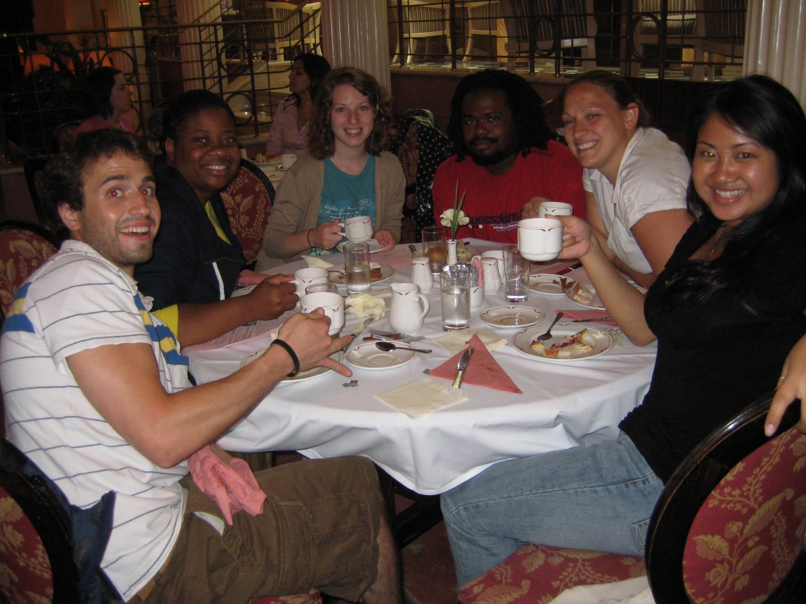 This afternoon we had a Cream Tea Reception at the Regency Hotel. It was all very fancy. Scones, clotted cream, pastys, cucumber sandwiches, puddings, and tea and all was very good. Here are Jake, Leslie, Laura, Ben, myself, and Mai. Notice Jake’s proper pinky finger etiquette.