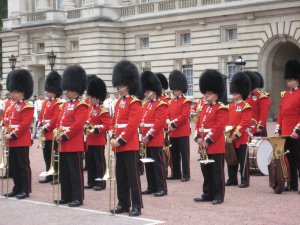 This will be a blog full of wildlife and fun. Casey and I both had the day off today so we decided to stroll the parks. We were to begin with St. James Park which is said to have a nice view of Buckingham Palace. We happened upon the changing of the guard and so stayed to watch. The band played and all was merry.