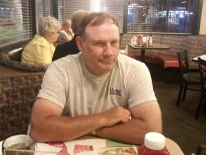 This is a picture of how Dad feels about running from the law! We chose Denny’s as the most inconspicuous hideout option.